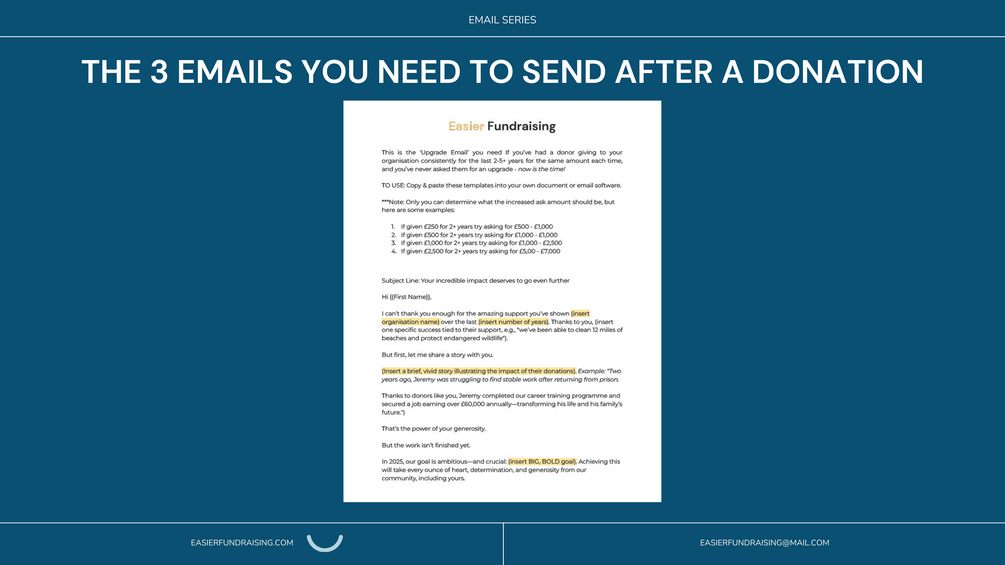 With this 3-email post-donation sequence, you’ll effortlessly nurture donor relationships, build trust, and increase repeat giving—without spending hours writing emails from scratch.